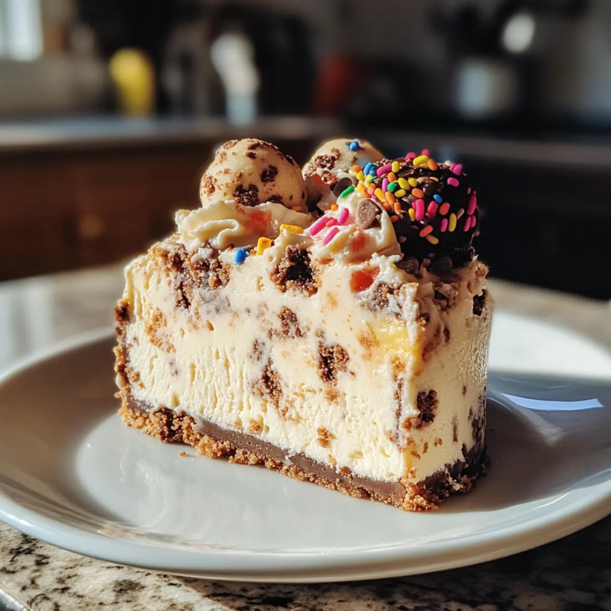While the crust cools, make your edible cookie dough. In a mixing bowl, cream together unsalted butter and cane sugar, then stir in vanilla extract and milk. Gradually add in flour and salt, folding in additional sprinkles for a festive touch. Roll the mixture into small balls and chill them in the refrigerator to firm up while you prepare the cheesecake filling.