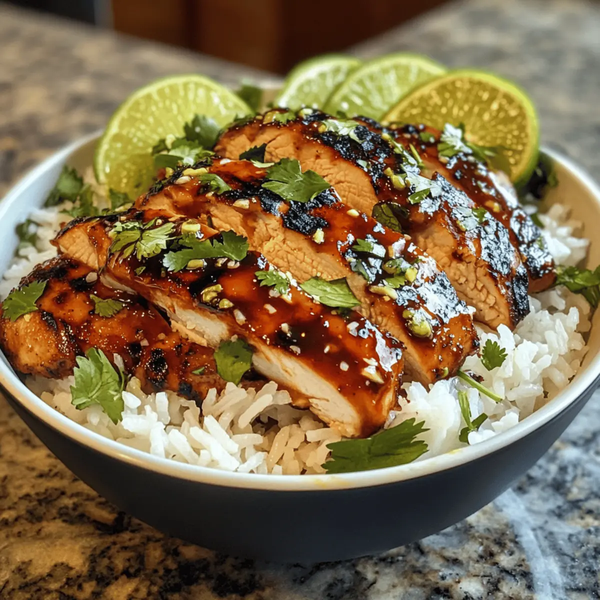 - Scoop jasmine rice into bowls, top with sliced chicken and drizzle with coconut lime sauce. Garnish with cilantro and lime wedges, and add chili flakes if desired.