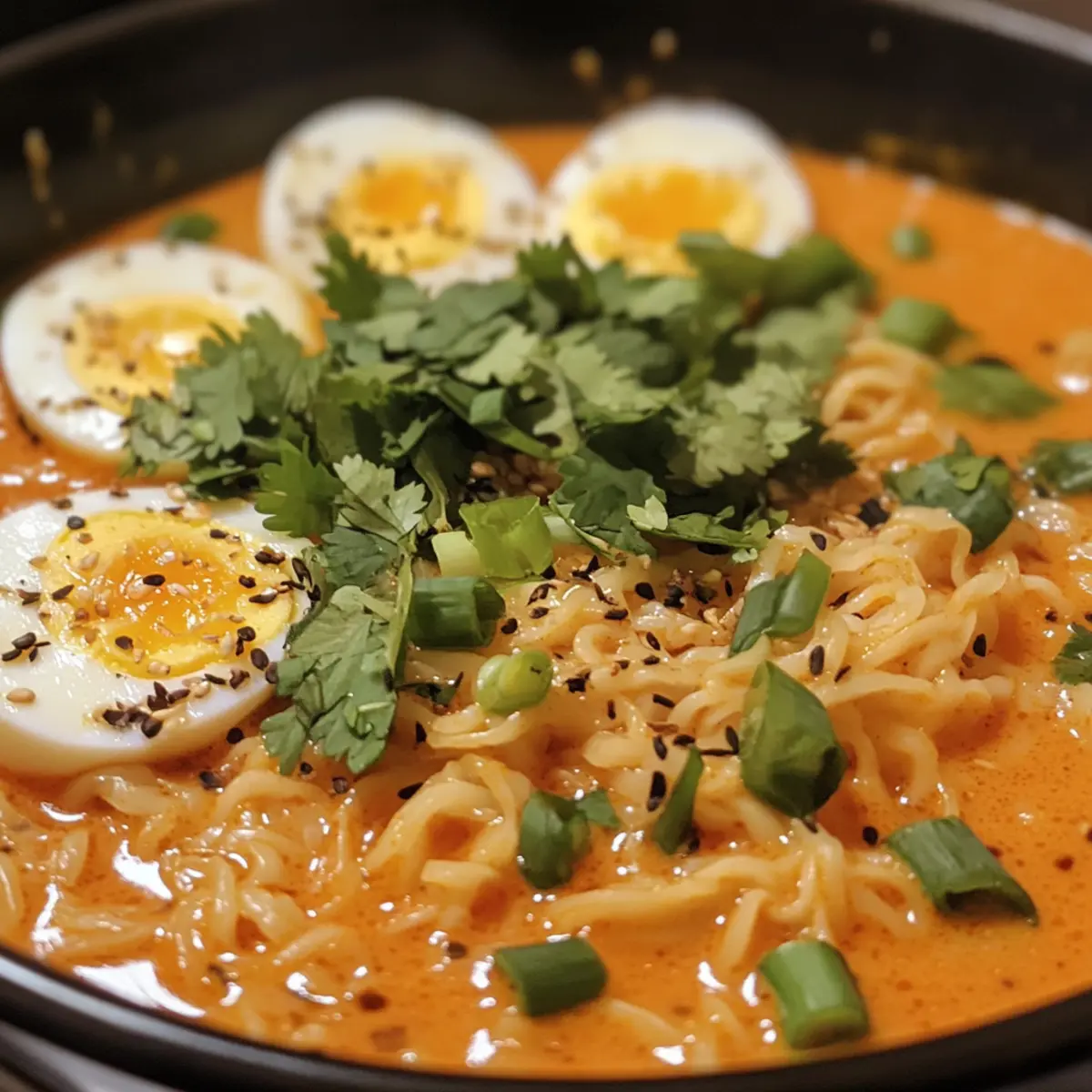 - Divide the cooked ramen noodles among bowls, ladle the coconut broth over, and top with cooked ground pork, soft-boiled eggs, cilantro, green onions, and sesame seeds.