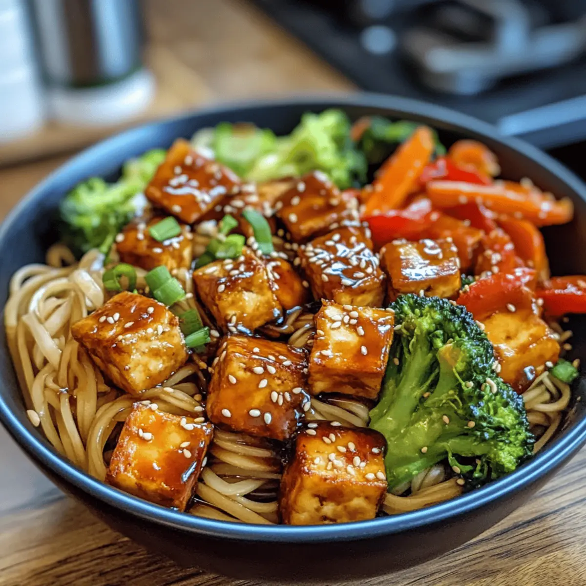 - Reduce the heat to medium-low and add the cooked noodles and crispy tofu into the skillet with the sautéed vegetables. Pour the thickened teriyaki sauce over the mixture, tossing everything together until evenly coated. Heat through for another 2–3 minutes.