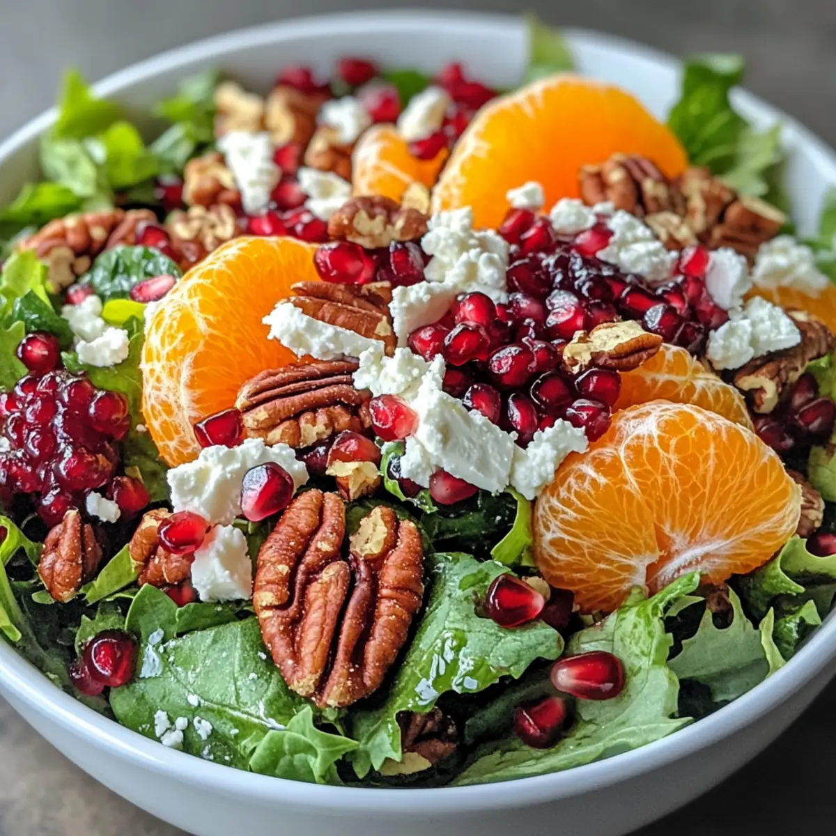 Roughly chop a handful of candied pecans and sprinkle them over the salad. Their sweetness and crunch are essential elements that elevate your dish. You should notice the pecans add an inviting crunchiness, contrasting nicely with the juiciness of the fruits. This ensures your Festive Winter Salad has a well-rounded texture and a festive flair.